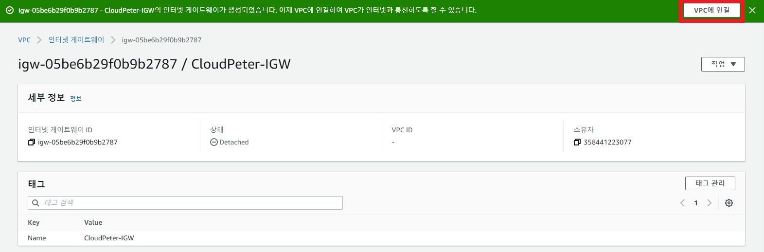 3. IGW와 VPC 연결 사용 가능한 VPC: 생성한 VPC 선택 (CloudPeter-VPC)