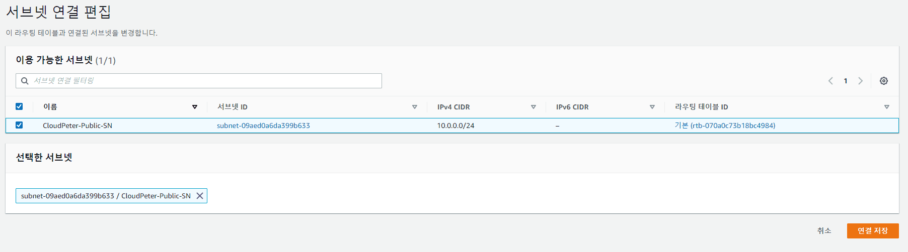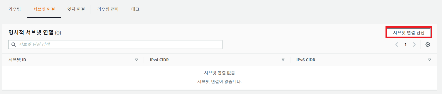 3. 생성 확인 및 서브넷 연결 서브넷 연결 클릭 서브넷 연결 편집 클릭 전에 생성한 서브넷 선택