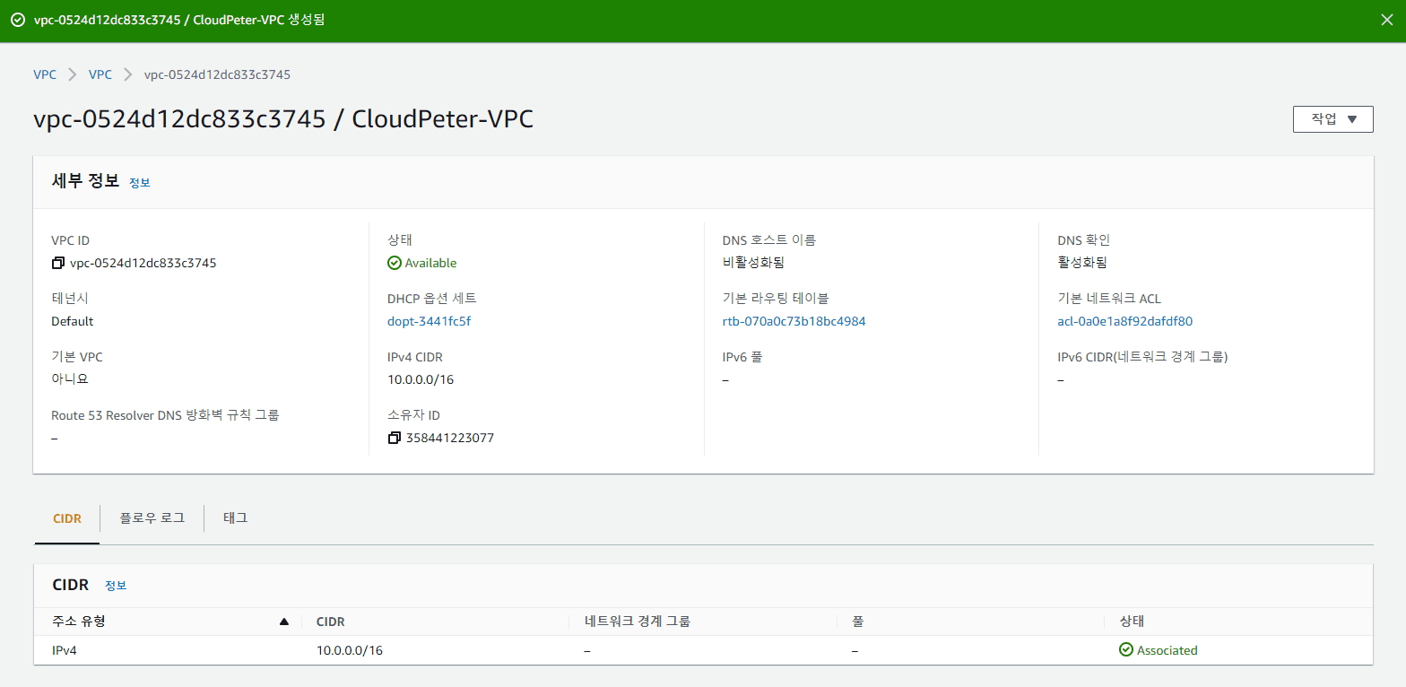2. 이름: CloudPeter-VPC IPv4 CIDR 블록: 10.0.0.0/16