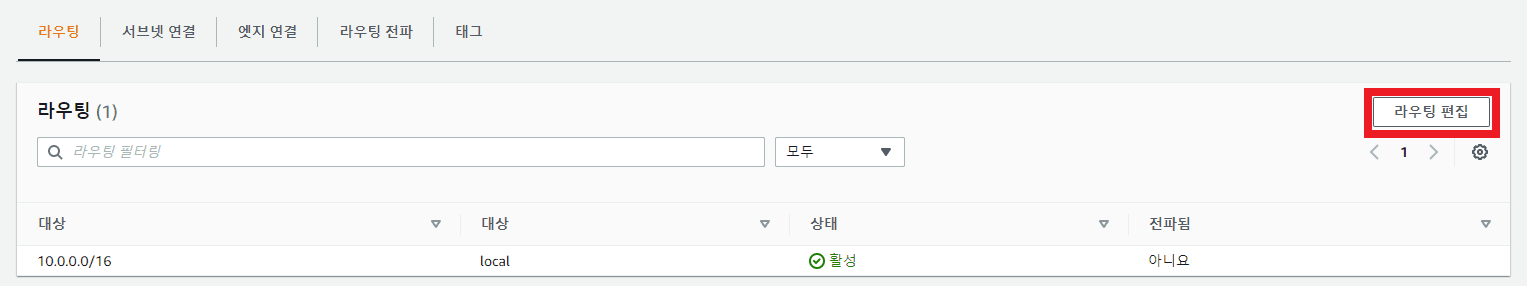 3. 라우팅 편집 클릭 다음과 같이 편집 (NAT 게이트웨이 선택)
