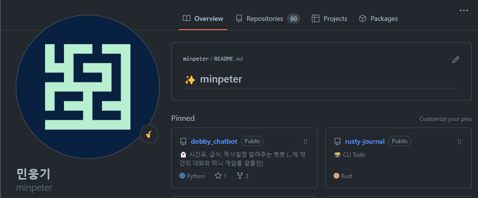 깃허브에 어느 순간 자신의 닉네임으로 레포를 생성하고 readme.md 파일을 작성하면 깃허브 프로필에 표시해주는 기능이 생겼다.