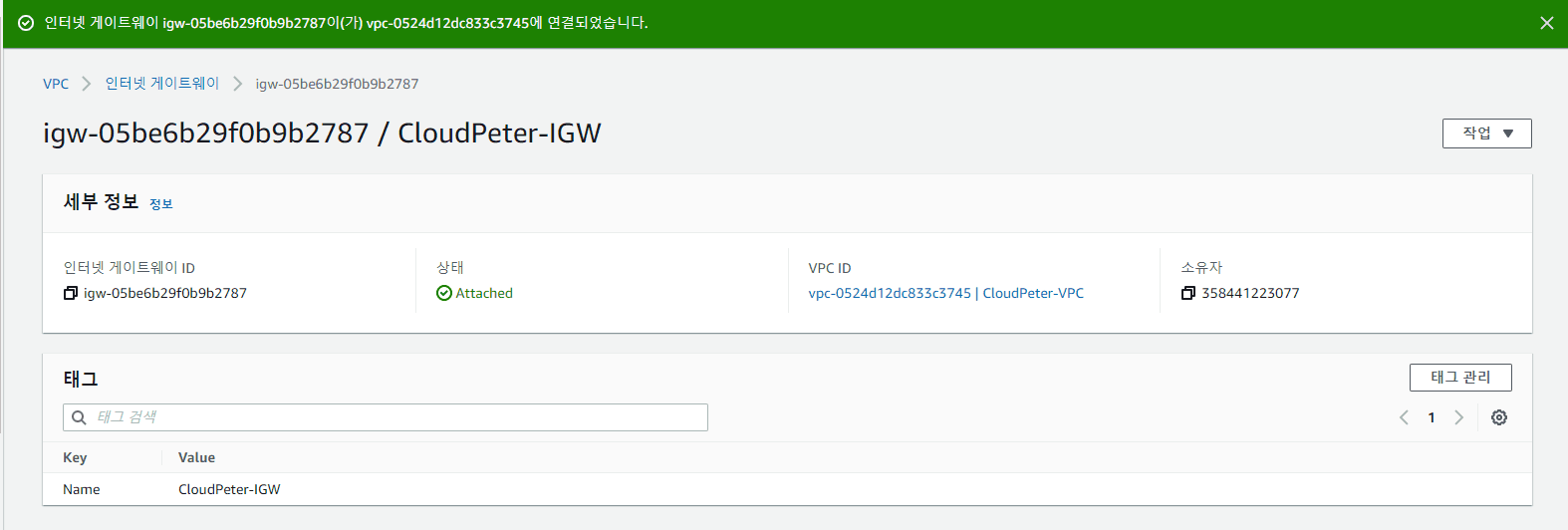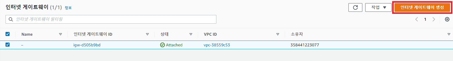 외부 인터넷 구간과 통신을 위해 IGW을 생성하고 VPC와 연결
