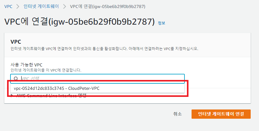 사용 가능한 VPC: 생성한 VPC 선택 (CloudPeter-VPC)