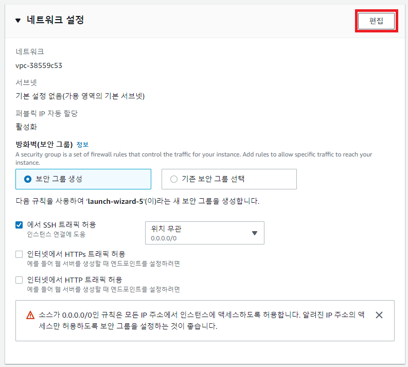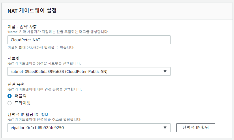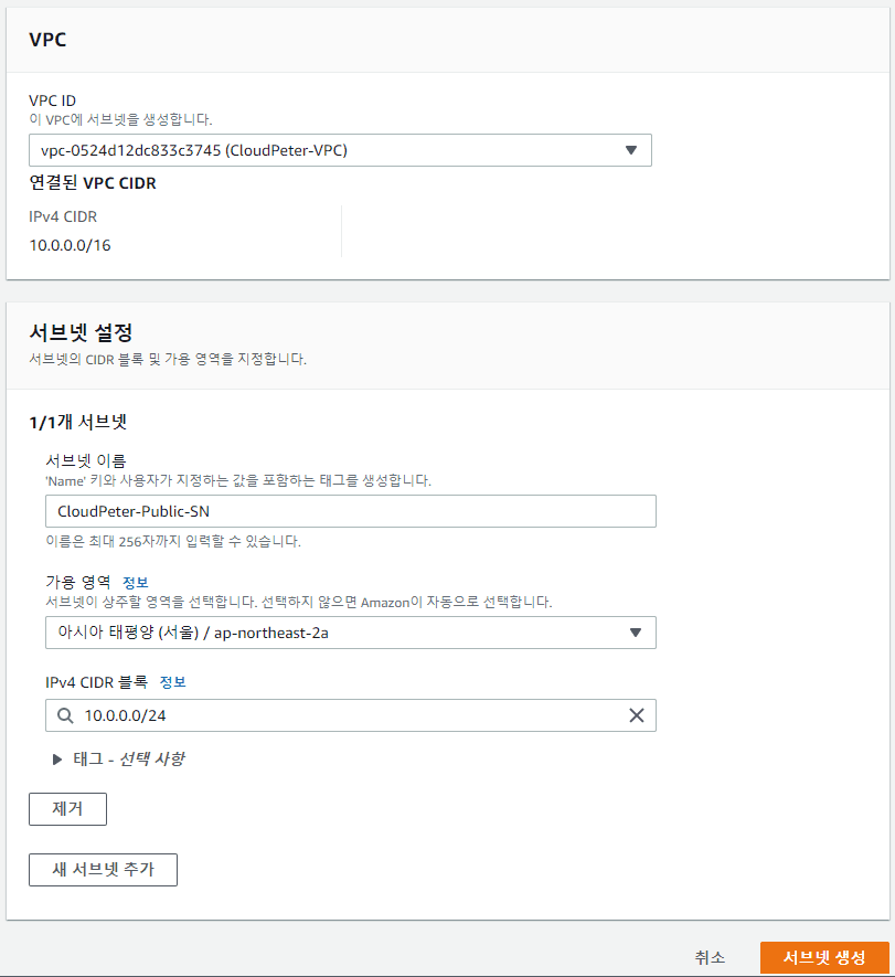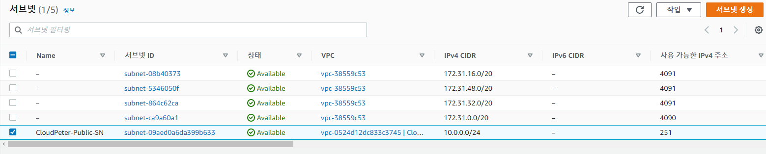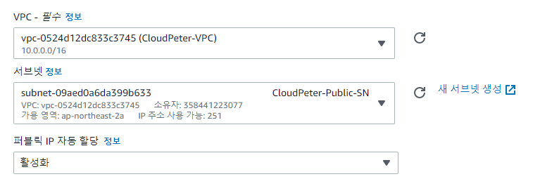 서브넷: 퍼플릭 서브넷 선택 (CloudPeter-Public-SN)