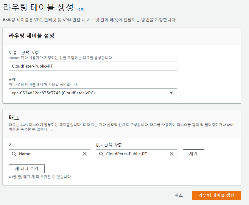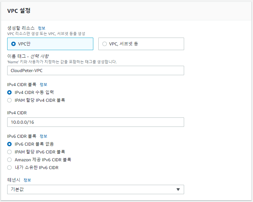 VPC ID: 생성한 VPC 선택 (CloudPeter-VPC)